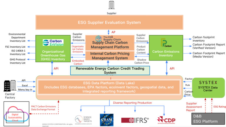 Using SaaS services, we provide carbon footprint solutions, including organizational carbon inventories and carbon footprint calculations. Through the ESG Data Platform, we help businesses integrate backend operational systems to achieve data automation. Additionally, SYSTEX’s data center, in collaboration with D&B’s ESG platform, supplies ESG Rating data to track supplier ESG progress.