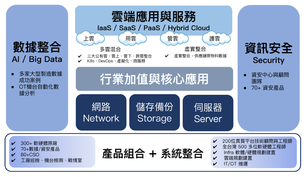 - ・提供全面的雲端應用開發與雲地系統整合,包括公有雲、私有雲和混合雲解決方案,靈活應對業務需求。